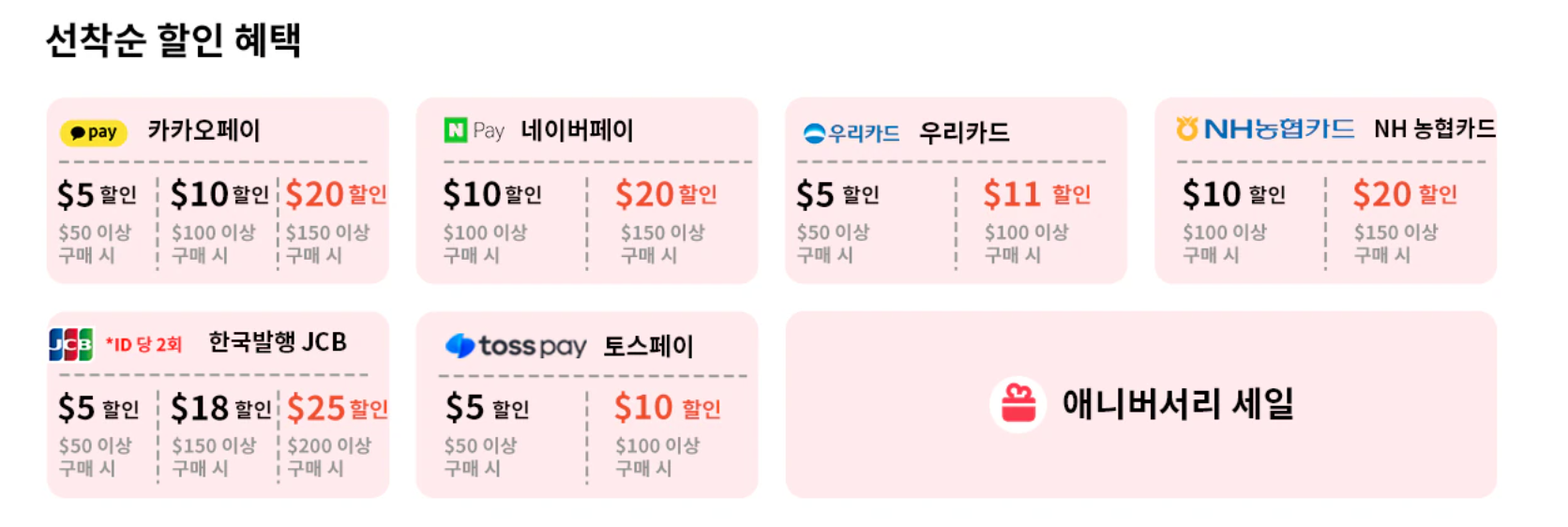 카드할인은 각종 할인 코드,쿠폰등과 중복으로 할인이 가능하며 선착순으로 진행이 되니 빨리 결제하시는것이 좋습니다.
